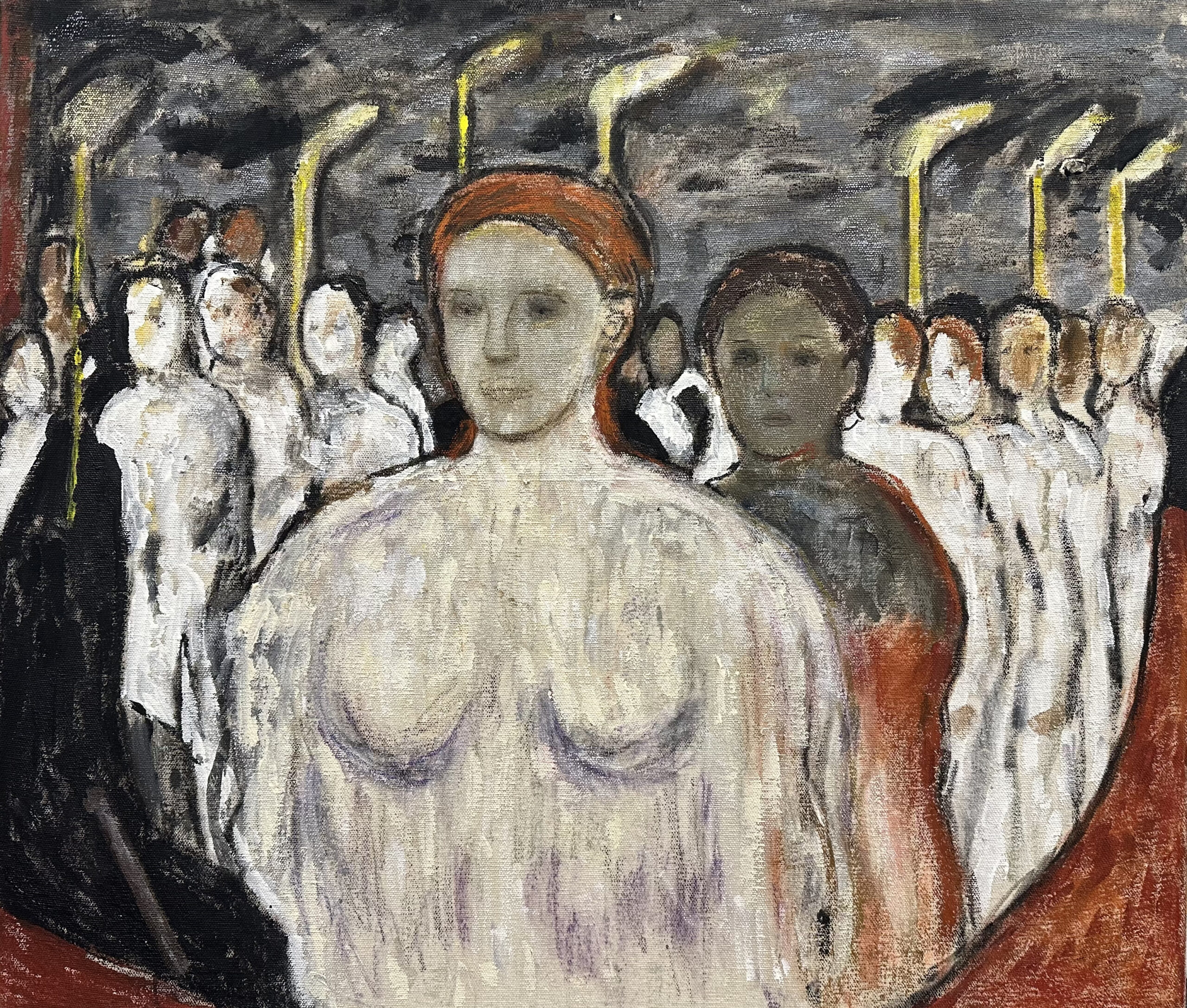 My work often features a solitary woman, drawing from personal experiences and universal emotions like loneliness, strength, and connection. I aim to express my feelings while leaving space for viewers to find their own meaning. A solitary figure might feel strong to one person and vulnerable to another, turning personal stories into shared experiences through art.