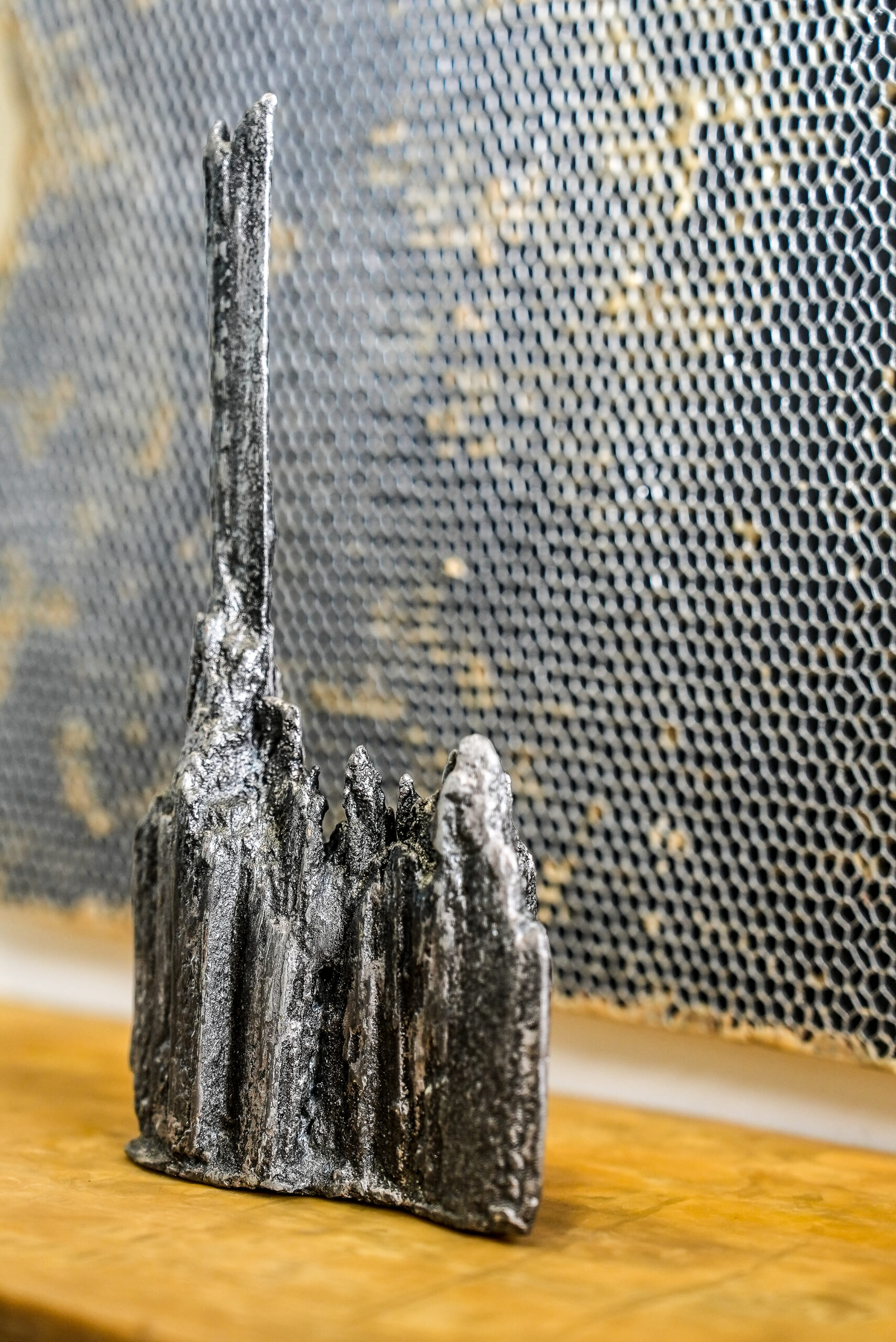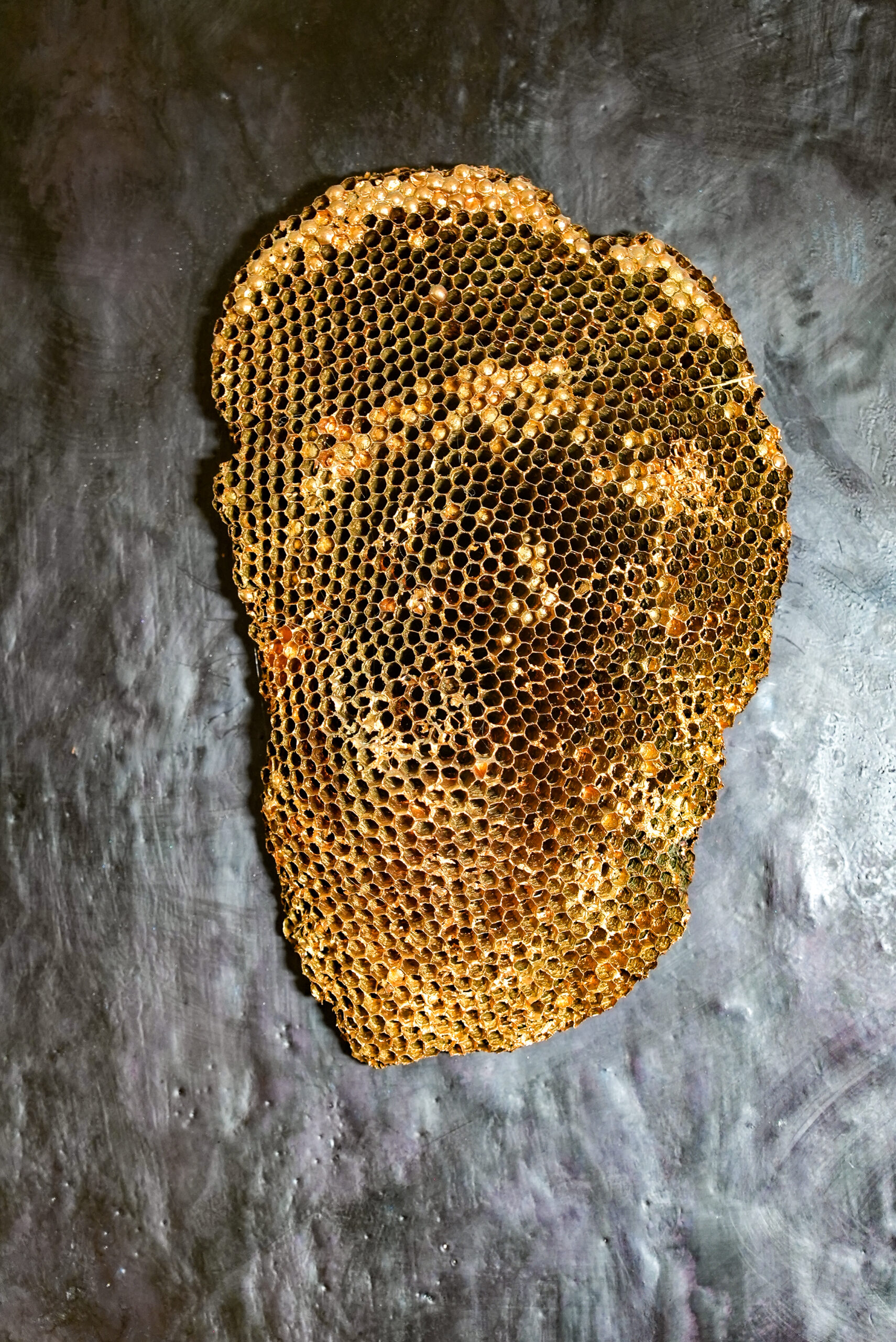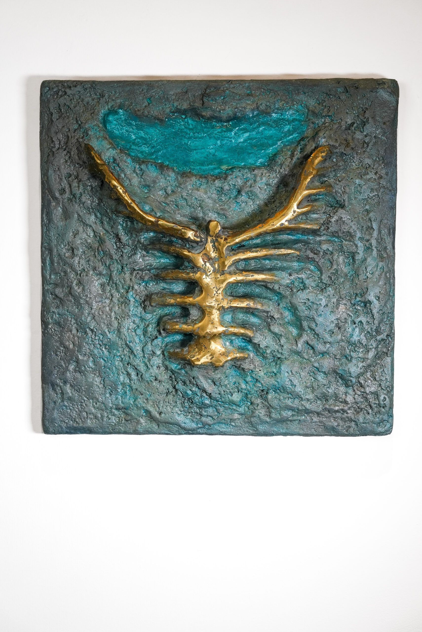 In her art Shauna Peck uses of a variety of materials to show her insightful investigation of universal metaphors and contemporary narratives. Her art particularly emphasizes the interconnectedness between technology and the appropriated natural landscape, reflecting her deep engagement with these themes. She explores the intricate relationship between new technologies, the simulated world, and the disappearing natural landscape. Her work is characterized by a continuous experimentation with a variety of materials and mediums, which dominate the surface quality of her pieces. The sensuous nature of charcoal and the reflective attributes of metallic pigments accentuate her depictions of a vanishing environment. Peck’s attraction to using bee’s wax, bronze, and cement is driven not only by their tactile appeal but also by their symbolic significance. These materials serve to hermetically seal images from reality, conveying a desire to protect a vulnerable landscape. Often, she reveals only a glimpse of a landscape or form, highlighting the stark contrast between untamed wilderness and human development.