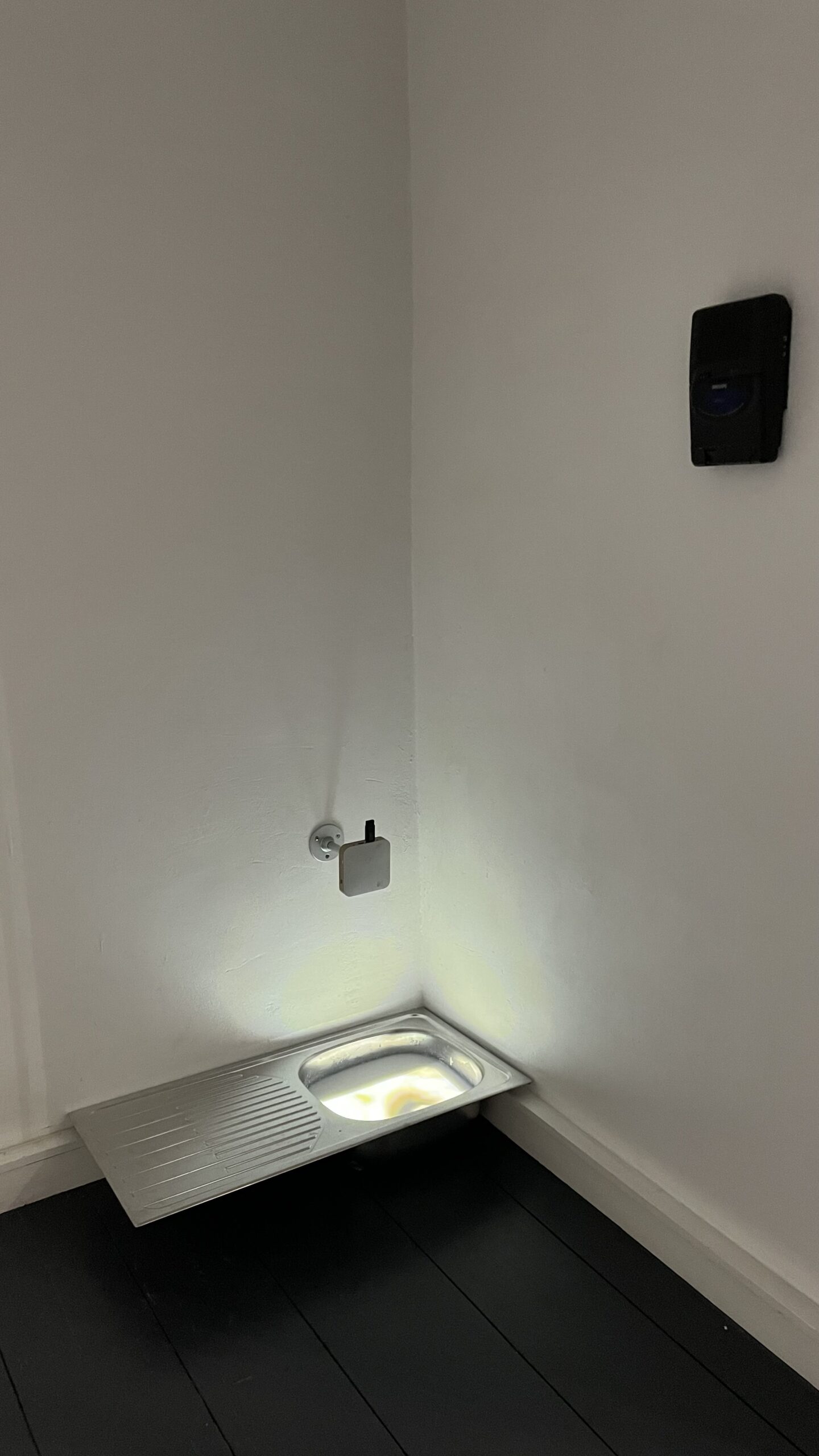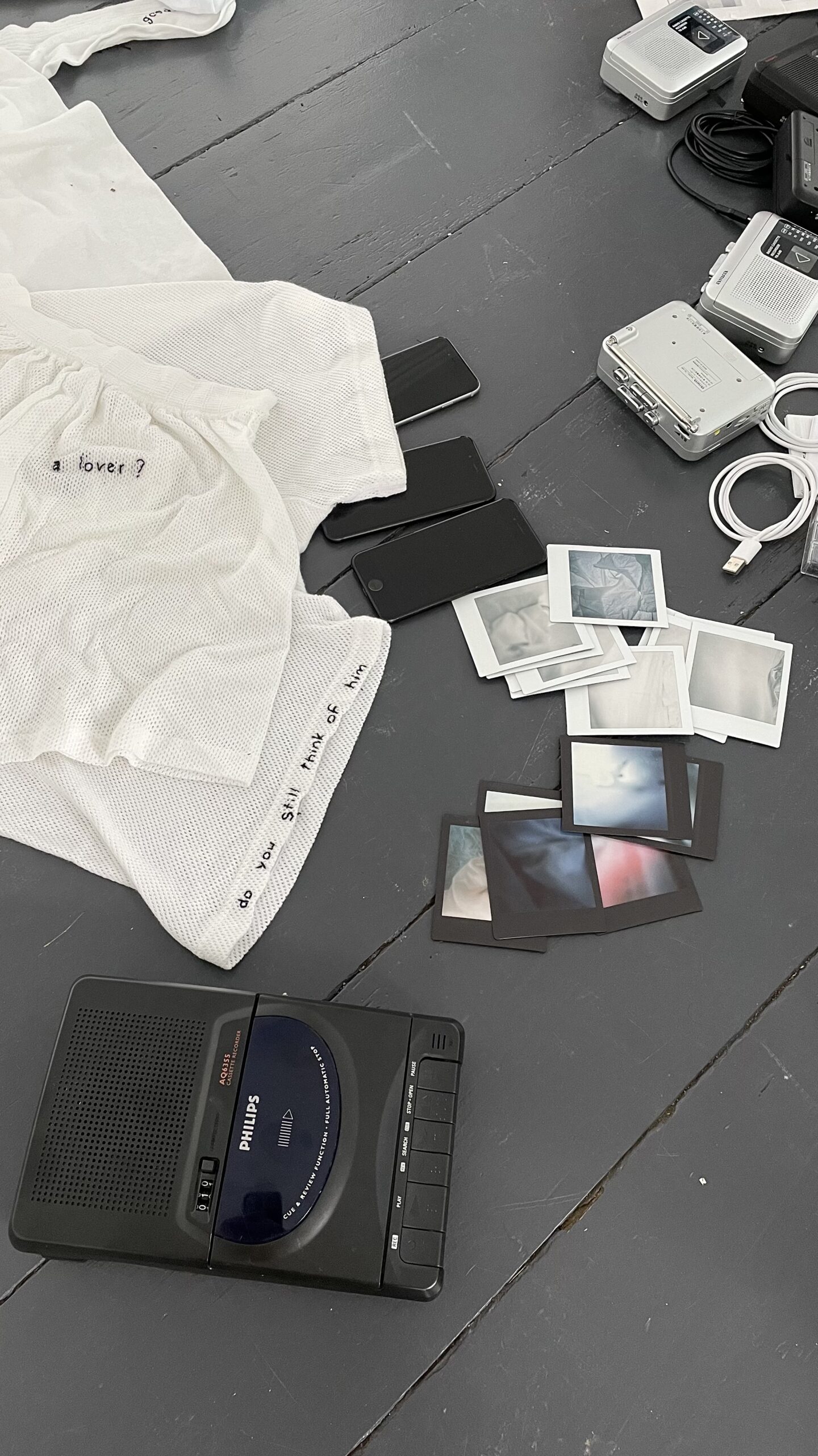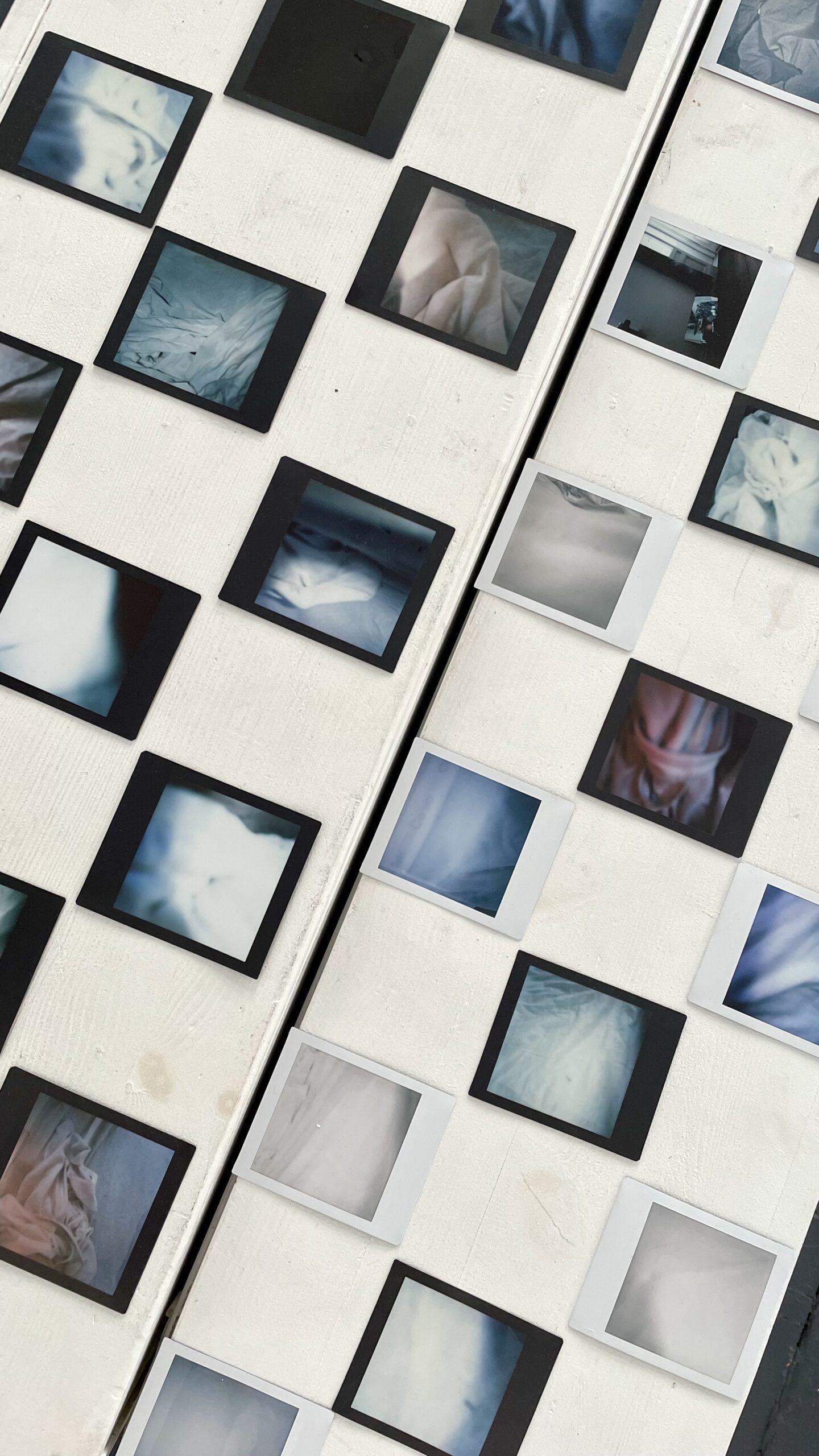 A compelling series of video interviews explores individuals’ relationships with their beds, revealing intimate stories and personal reflections — bridging the boundaries of personal and shared experiences. Complementing this, a sound installation crafted from cassette tapes further enhances the contemplative ambiance. Recorded from the silent parts of vinyl, this “fake silence” offers pauses and spaces to wonder. The video piece “Closer”, casted onto a white-water surface, shows close-up of intimacy, allowing a glance into the performance piece, “Untitled (by your side)”.